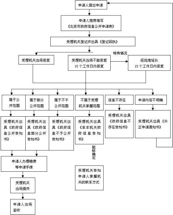 1.提出申请 向bt365体育在线投注提出申请的,推荐填写《北京市农业局政府信息公开申请表》(以下简称《申请表》)。申请表复制有效,可以到bt365体育在线投注受理机构处领取。 为了提高处理申请的效率,申请人对所需信息的描述请尽量详尽、明确;若有可能,请提供该信息的名称、生成日期或者其他有助于本机关确定信息的提示。 申请人可以通过以下途径提出申请: (1)信函、电报、传真申请。申请人通过信函方式提出申请的,请在信封左下角注明“政府信息公开申请”的字样;申请人通过电报、传真方式提出申请的,请相应注明“政府信息公开申请”的字样。 (2)当面申请。申请人可以到bt365体育在线投注受理机构,当场提出申请。 bt365体育在线投注不受理通过电话方式提出的申请,但申请人可以通过电话进行咨询。 2.登记 对于有效的申请,bt365体育在线投注须进行登记,并出具登记回执。 申请获取的信息如果属于bt365体育在线投注已经主动公开的信息,bt365体育在线投注中止受理申请程序,并在法定时限内告知申请人获得信息的方式和途径。 3.答复 收到申请后,能当场答复的,将当场给予书面答复;不能当场答复的,在登记之日起15个工作日内书面答复申请人。如需延长答复期限的,应当经bt365体育在线投注政府信息公开工作机构负责人同意,并告知申请人,延长答复的期限最长不得超过15个工作日。 (1)属于应当公开的,应当告知申请人获取信息的方式和途径,出具《政府信息公开告知书》。需要延长公开期限的,应说明延长的理由和期限; (2)属于不予公开的,应当告知申请人不予公开,出具《政府信息不予公开告知书》,并告知其不予公开的理由; (3)不属于北京市bt365体育在线投注公开的,应当告知申请人;能够确定该信息公开机关的,告知该机关的名称、联系方式,出具《非本机关政府信息告知书》; (4)申请公开的政府信息不存在的,应当告知申请人,出具《政府信息不存在告知书》; (5)申请公开的内容不明确的,应当告知申请人更改、补充申请,出具《政府信息补正申请通知书》; (6)申请公开的政府信息中含有不应当公开的内容,如能作区分处理,应当告知申请人,出具《政府信息部分公开告知书》 流程图